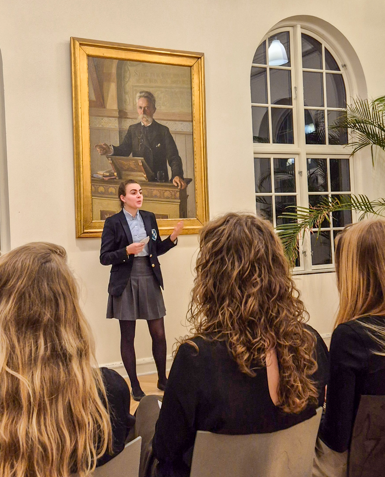 Konkurrencen fandt sted i gymnasiets gamle bibliotek – en ramme, der passede godt til aftenens retoriske fokus. På væggen hang et portræt af en tidligere rektor midt i en tale, som en diskret påmindelse om, at denne aften handlede om ord, stemmer og fortællinger.