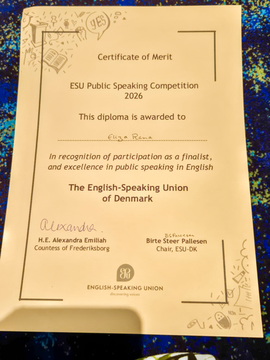Den 3. marts var jeg så heldig at blive udtaget til den danske finale i English-Speaking Union’s International Public Speaking Competition, som blev afholdt på Ordrup Gymnasium.
